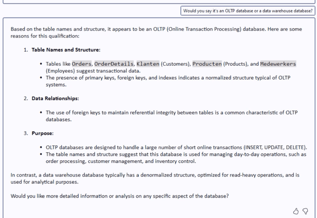 The context you need for this image is that I played the role of an accidental DBA who just got handed a new database. I wanted to know things about the database, so Copilot previously gave me information on the tables, columns, and general structure. Now, I want to know what kind of database this is; mainly, I’d be interested in whether it’s an OLTP or a Data Warehouse database. Copilot is showing its work and talking me through the process.