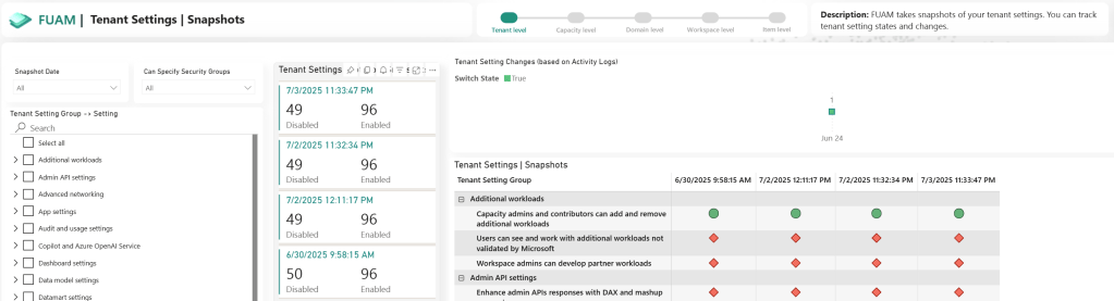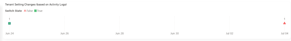 Another very interesting part of Fabric is the tenant settings. Anyone with the Fabric Administrator role can change these settings, and you can’t detect who changed a setting from the portal. However, there are other ways to find out, because, again, FUAM will not only provide a comprehensive overview of all the settings and their history (making it easy to see when a specific setting changed) but also identify who is the culprit.