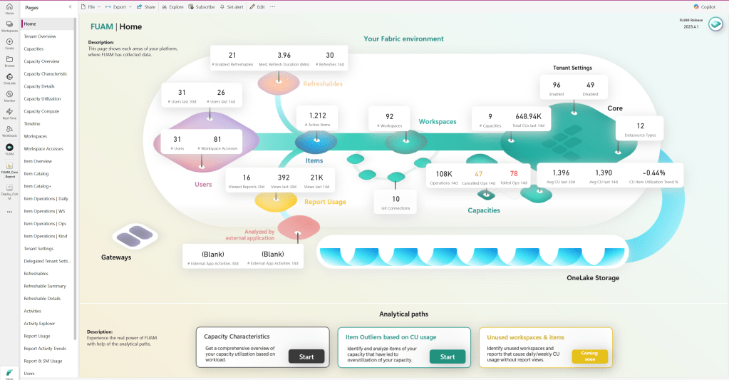 This report provides a general overview of your Fabric estate, with a huge list of options to choose from on the left.