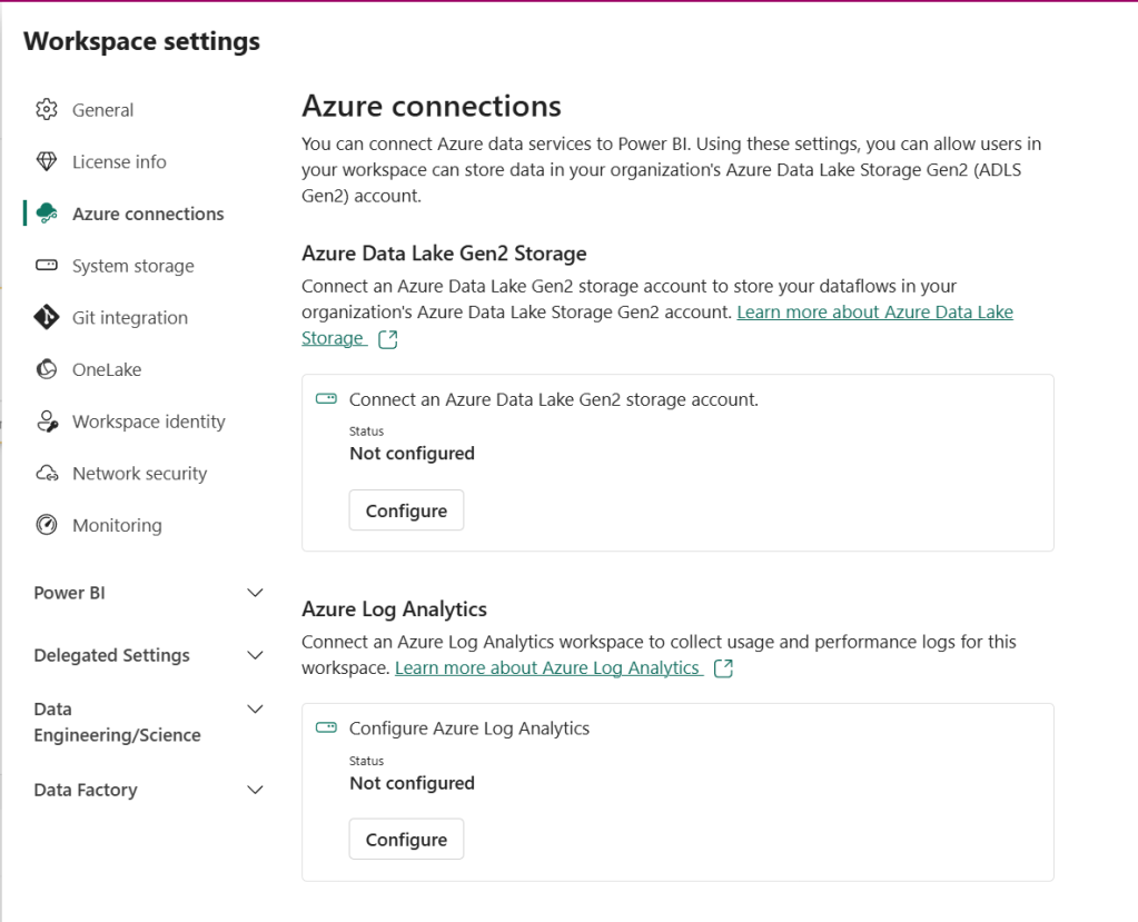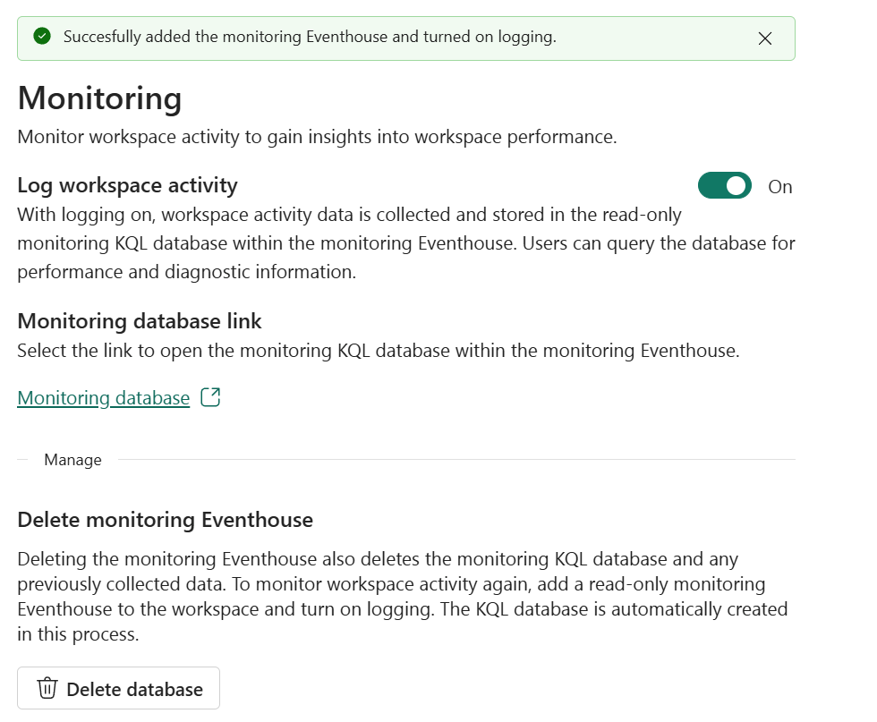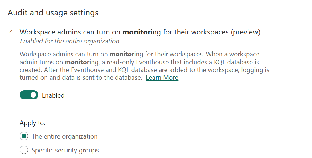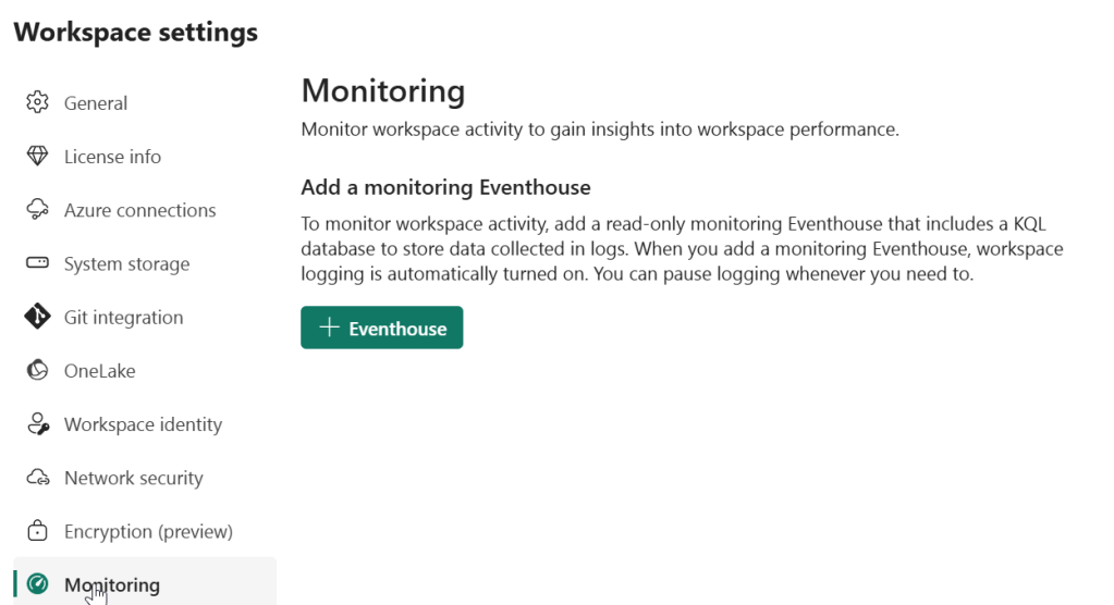 Also, make sure that the setting above, writing to a Log Analytics Workspace, is disabled. You can’t do both. Fabric will return an error that doesn’t tell you what is blocking you. So, if you run into an issue configuring the Eventhouse, make sure the export to the Log Analytics Workspace is disabled.