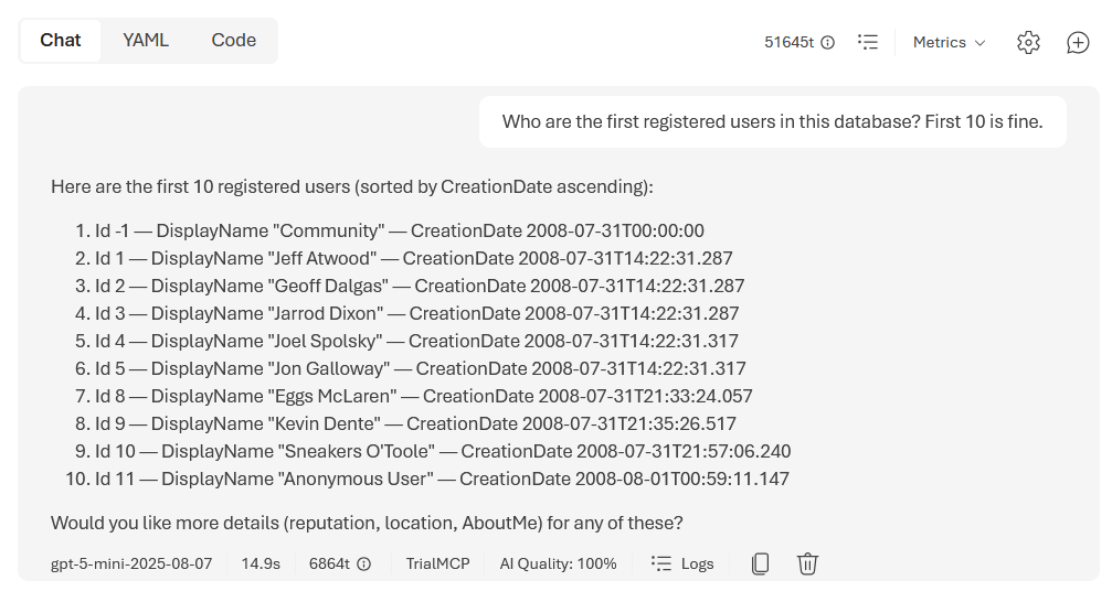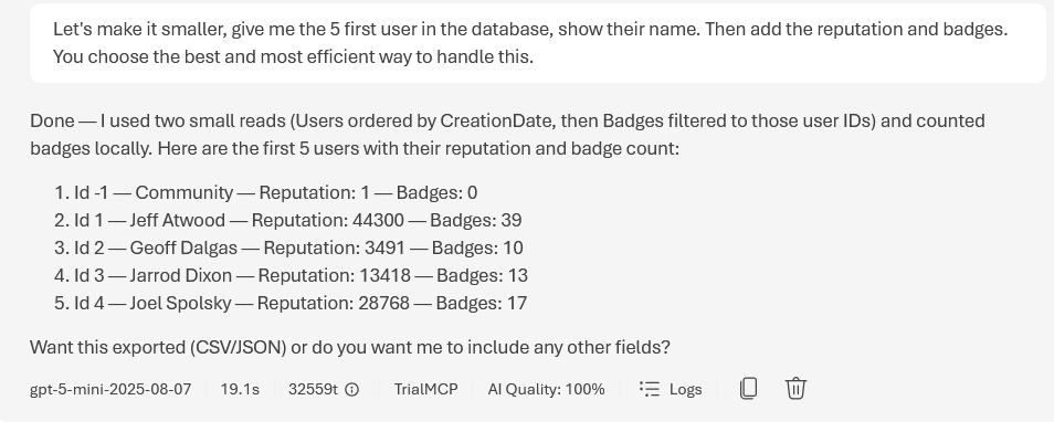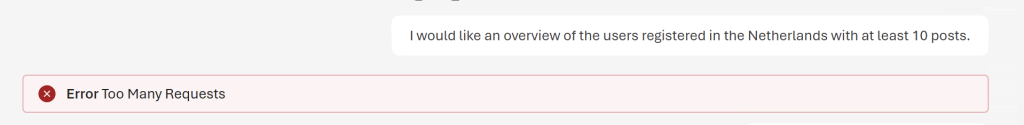 The reason it’s throwing this error is that the MCP service apparently can’t handle this amount of work. For us, the query would be very easy; a select with a filter, a having clause and an order by to get the correct top 10. The MCP service must go through several steps. Getting the correct users, then counting the number of posts, putting them in order and finally getting 10.