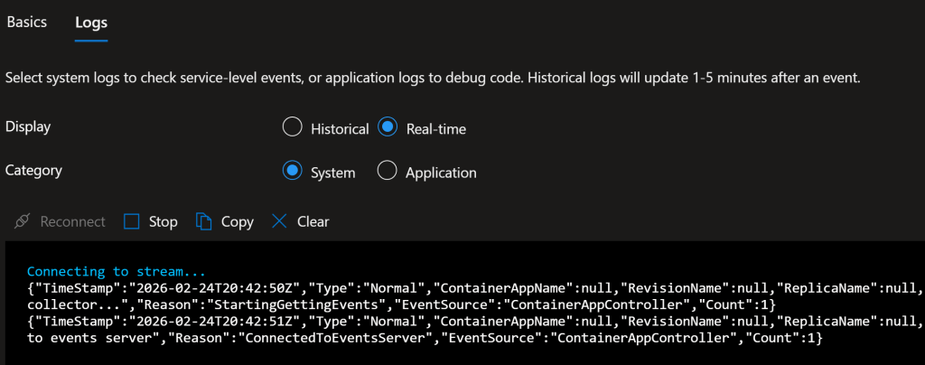 The above screenshots looked really amazing, but they weren’t from my MCP. It was hallucinating like crazy. Because I was running build 83, essentially, the container never started. Something that you can see when you take a good look at the container app. What you want to see is a message that the container app is running.