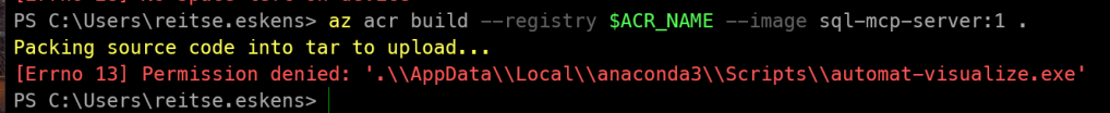 It took me way too long to realise that this was both my company laptop playing up, and also running the code in the wrong folder. The easiest fix for me was to move both files into a new folder: C:\Temp\MCP. The ACR build takes a few seconds, and you’re done.