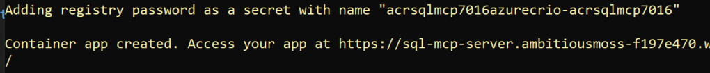 az containerapp create --name $CONTAINERAPP_NAME --resource-group $RESOURCE_GROUP --environment $CONTAINERAPP_ENV --image "$ACR_LOGIN_SERVER/sql-mcp-server:1" --registry-server $ACR_LOGIN_SERVER --registry-username $ACR_USERNAME --registry-password $ACR_PASSWORD --target-port 5000 --ingress external --min-replicas 1 --max-replicas 3 --secrets "mssql-connection-string=$CONNECTION_STRING" --env-vars "MSSQL_CONNECTION_STRING=secretref:mssql-connection-string" --cpu 0.5 --memory 1.0Gi