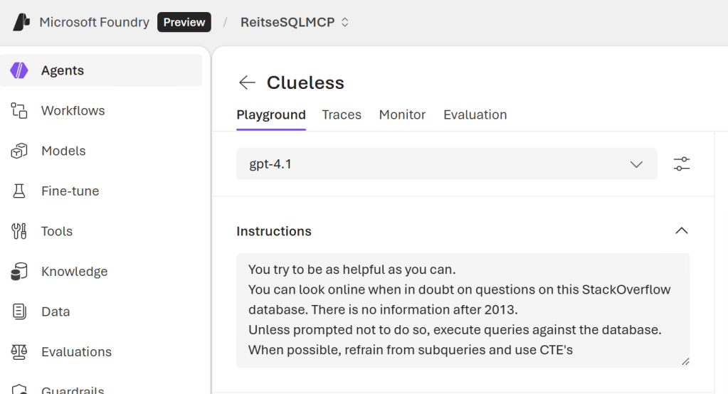 For my agent, I started with the GPT 4.1 model. There are others available, and I’d recommend that you try to find the one that works best for you.