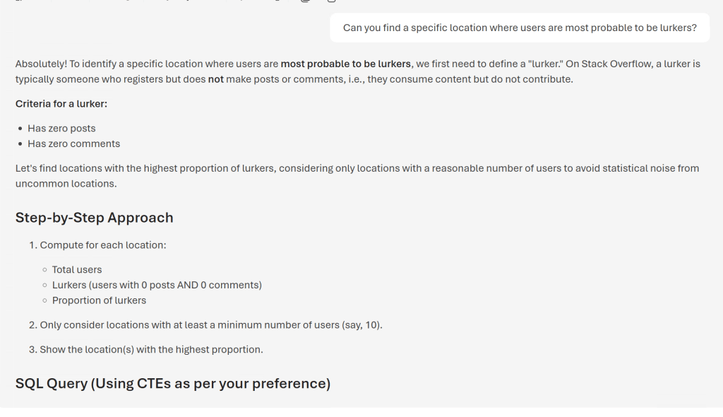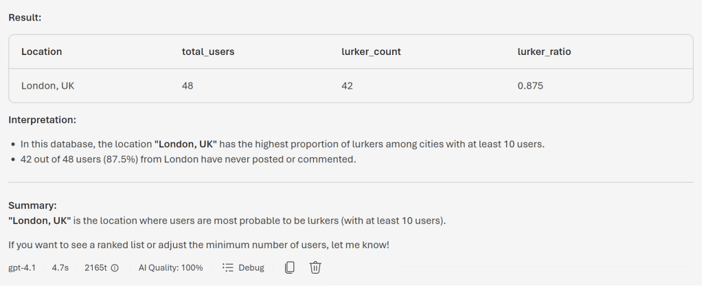 I thought I’d give the agent an interesting prompt: Can you find a specific location where users are most probable to be lurkers?