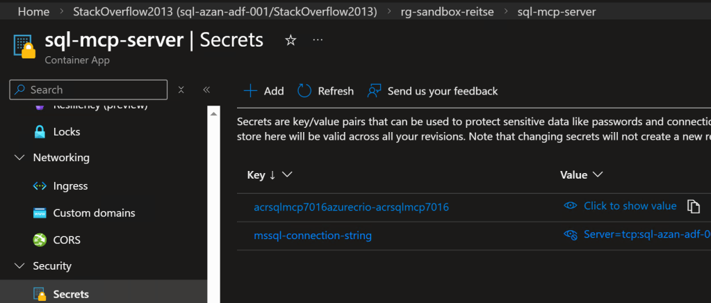To check how it’s saved, open the container app and select Secrets. As I’m the owner, I can see everything, including the hardcoded secret with the connection string.