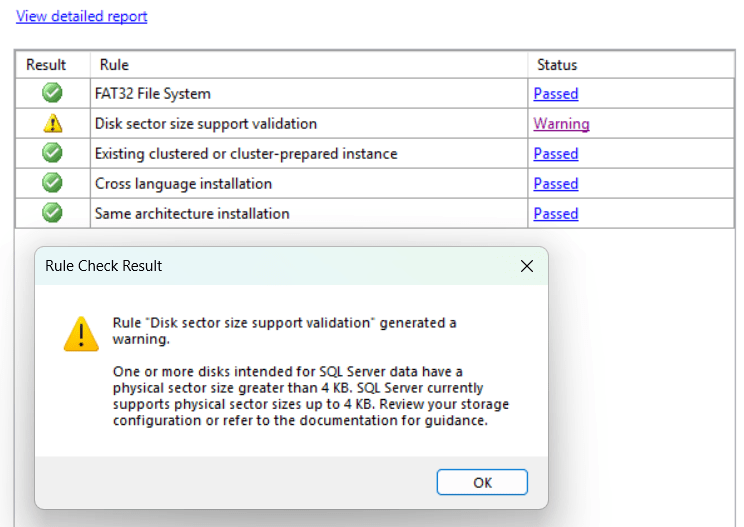 Warning LargeSectorSizeCheck One or more disks intended for SQL Server data have a physical sector size greater than 4 KB. SQL Server currently supports physical sector sizes up to 4 KB. Review your storage configuration or refer to the documentation for guidance.